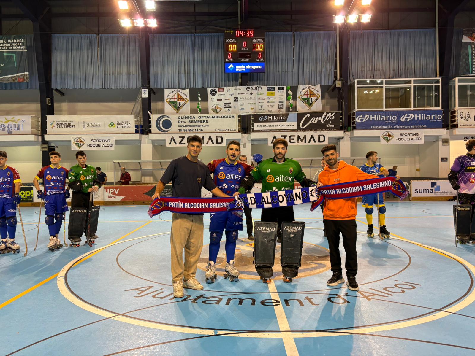 Ayer, antes del encuentro que enfrentó al conjunto AITEX PAS Alcoy frente al Caldes —partido que finalizó con una victoria por 4-1—, los jugadores del Alcoyano Jagoba Zárraga y Adri Lledó realizaron un intercambio de bufandas y carnés con Gonzalo Pérez y Guiri, jugador y capitán respectivamente del Alcodiam, equipo de hockey patines que milita en la máxima categoría nacional y que este año competirá también en Europa.